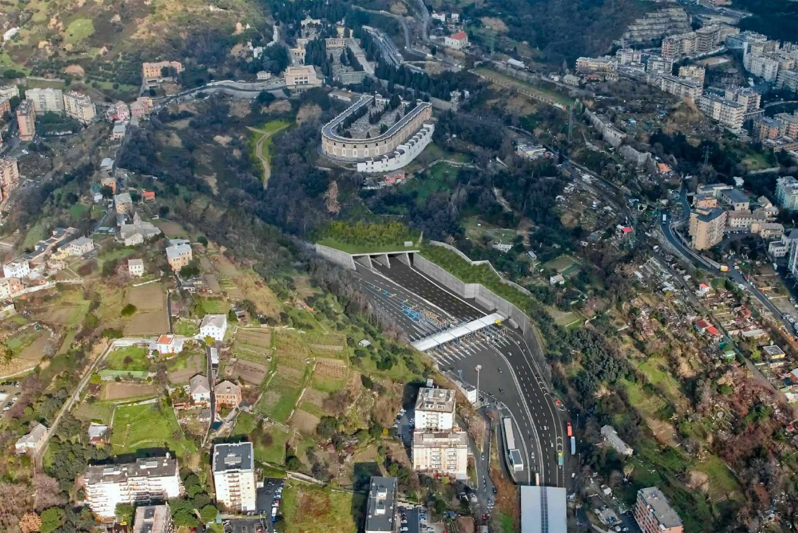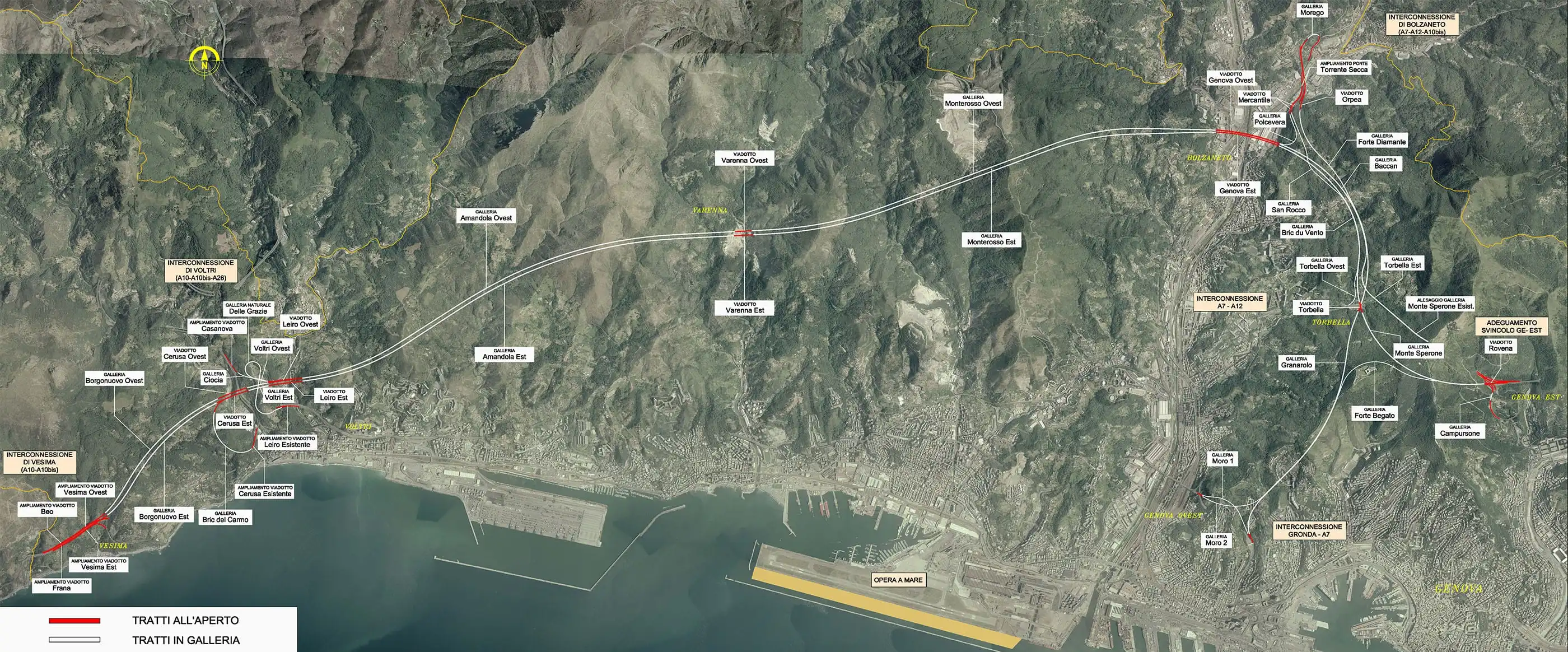 The Gronda di Genova is a new motorway section with two lanes in each direction, which doubles the existing A10 motorway in the section crossing the municipality of Genoa (from Val Polcevera to the built-up area of Vesima). The new infrastructure includes 65 km of new motorway routes and connects to the junctions delimiting the city area (Genova Est, Genova Ovest, Bolzaneto), connects to the A26 at Voltri and rejoins the A10 at Vesima. Given the orographically complex nature of the area crossed, the new road system is almost entirely underground and includes 23 tunnels, for a total of 50 kilometres, about 81% of the entire route.