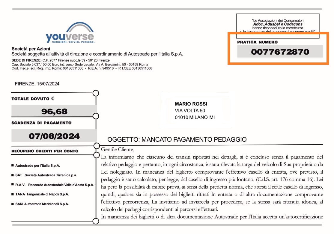 Each ticket (Unpaid Toll Report) contains the report number, the vehicle data (number plate and class), the transit data (date, time, exit toll gate and, where available, also the entry toll gate), the amount to be paid and the method of payment.