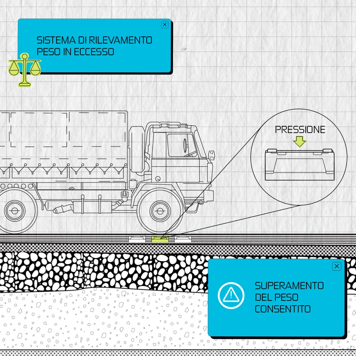 Il sistema rileva in modo dinamico la massa dei veicoli in transito lungo la rete, attraverso sensori posti sul manto stradale. Algoritmi software rilevano il superamento del limite consentito e attivano un sistema di alert che avvisa le autorità preposte. Allo stesso tempo il sistema attiva le procedure, quali le comunicazioni al mezzo sui pannelli a messaggio variabile e l’attivazione dei lampeggianti, per impedire il transito al veicolo segnalato, salvaguardando la sicurezza dei viaggiatori e delle infrastrutture.